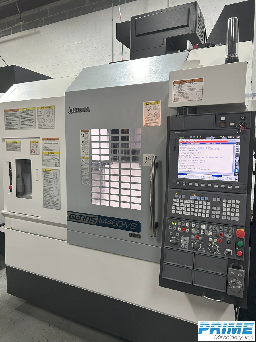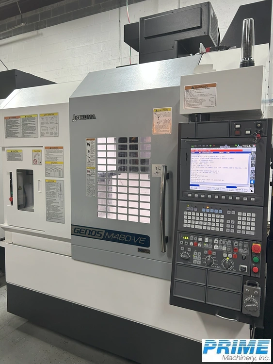 2019 OKUMA GENOS M460-VE CNC Vertical Machining Center, robust 30 hp & 15,000 RPM, CAT-40, 3-axis, 32 ATC, OSP P300M Control, Renishaw Probe, Chip Conveyor. Efficient precision for diverse applications.