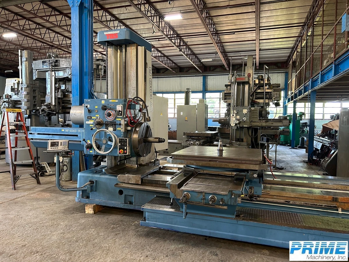 Explore this 2005 TOS W100A Horizontal Boring Mill: 4" spindle, 35.5" travel, robust 49"x49" table. Includes 4-axis DRO, rotary table, threading, and continuous feed facing head. Used, well-equipped for demanding tasks.