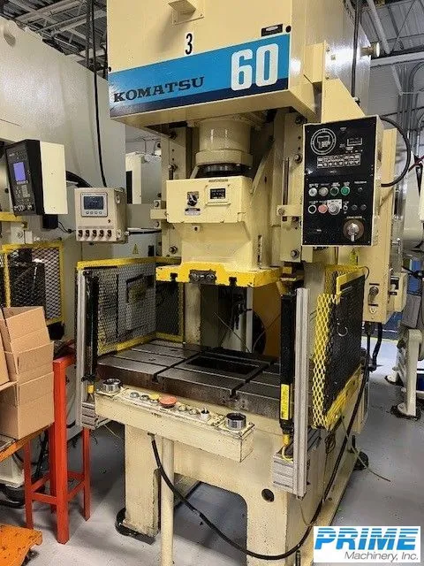 KOMATSU OBS 60-3, open back non-inclinable press. Max capacity 66 tons, 70 SPM, slide stroke 4.72". Machine approx. 106.7" tall, 40" wide, 55" FB. Equipped with Weld Tron light curtain.