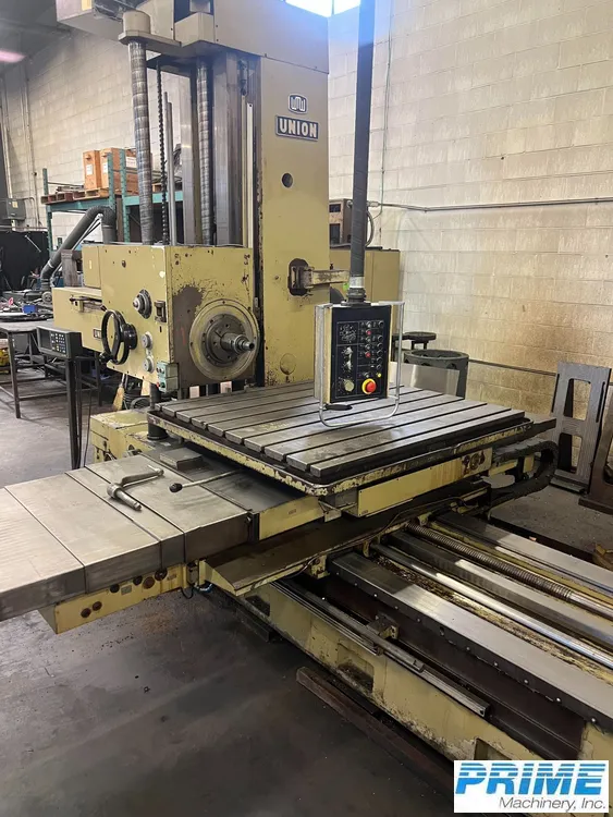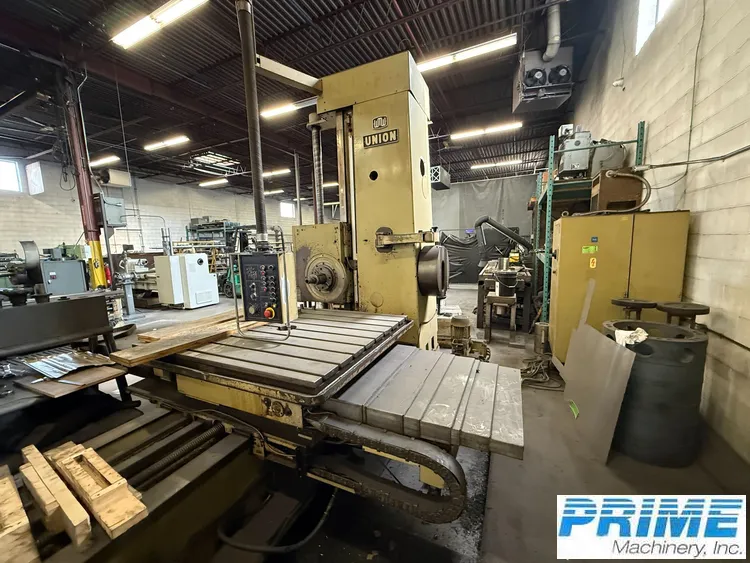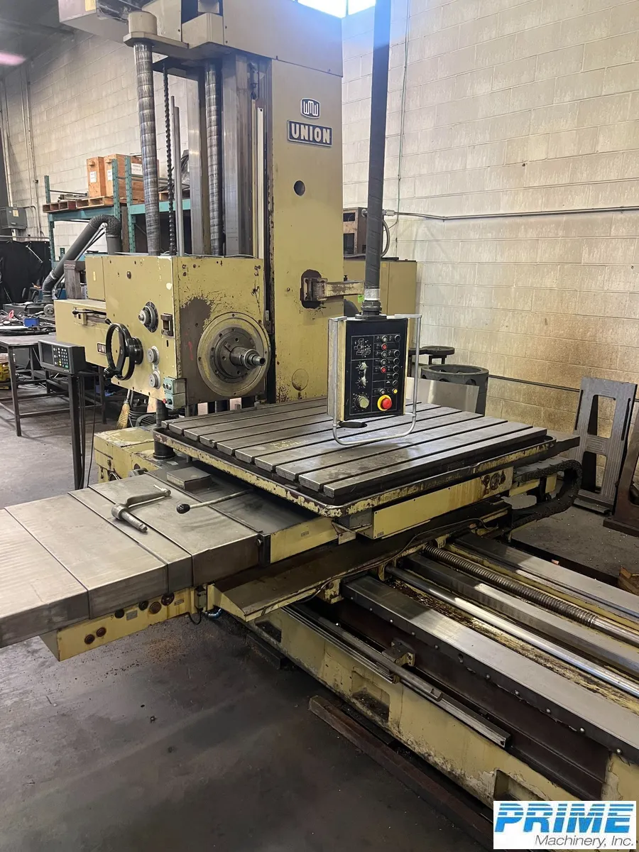 UNION BFT 90/3-1 horizontal boring mill, 1987 model with 3.54" spindle. 1,600 RPM. Features X/Y/Z travels of 63"/50"/63", 15 HP motor, and 5,500 lbs table load Capacity. Equipped with power draw bar, digital readouts, facing head and available tooling.