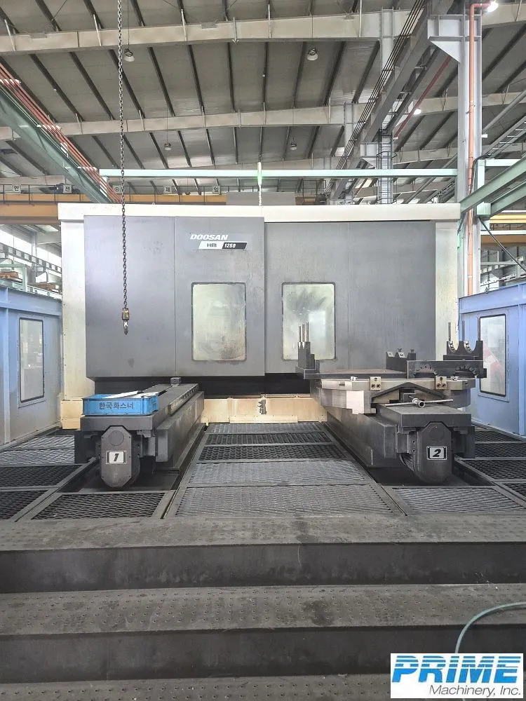 For sale: Doosan HM 1250 Horizontal Machining Center, 2019 model. Equipped with FANUC 31i-B CNC, coolant through spindle, chip conveyor, and more. X/Y/Z travels: 82"/60"/60", tool changer for 60 tools. Only 4,613 cutting hours.